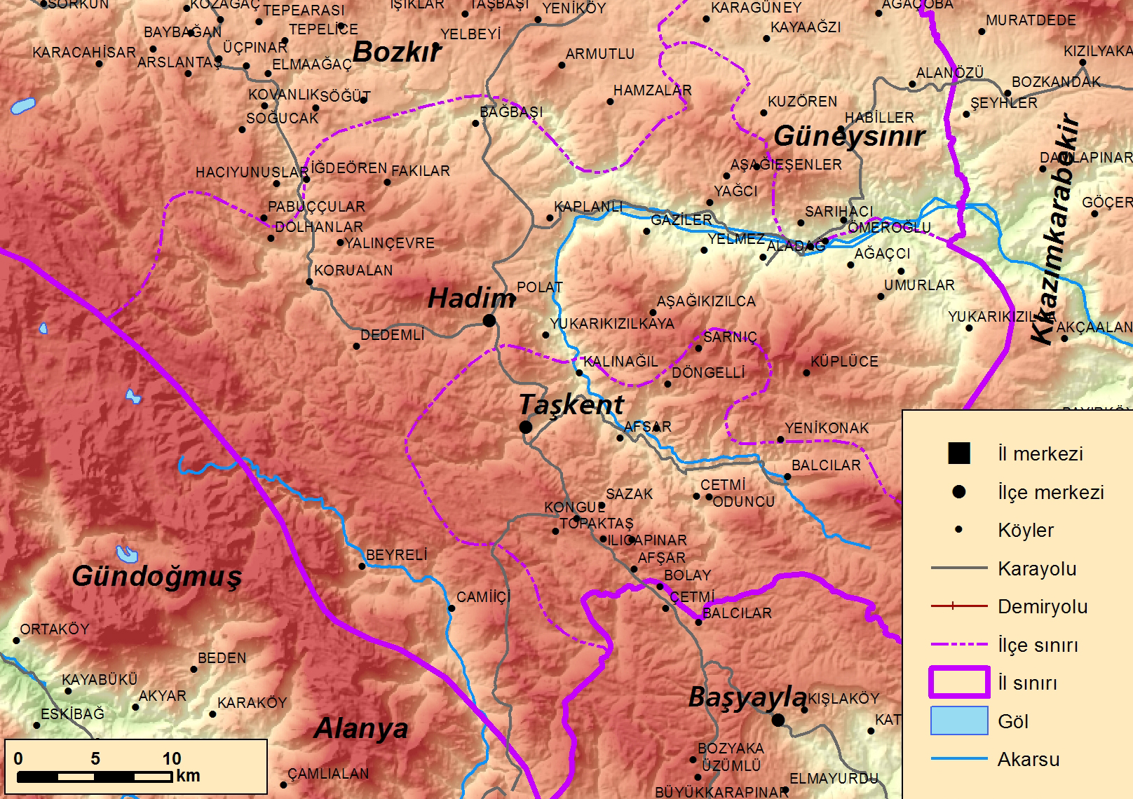 İlçe sınırlarından Akdeniz’e yaklaşık 50 km olan dağlık sahadan, güneye bakılınca Akdeniz’in mavi suları, ilçenin güney yamaçlarına yaslanmış olan, Akdağ’dan kuzeye bakılınca, Konya Ovası görünmektedir.